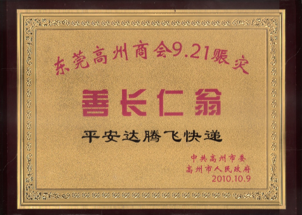 東莞高州商會9.21振災-善長仁翁榮譽證書