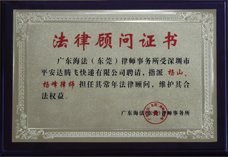 廣東海法(東莞)律師事務所法律顧問證書